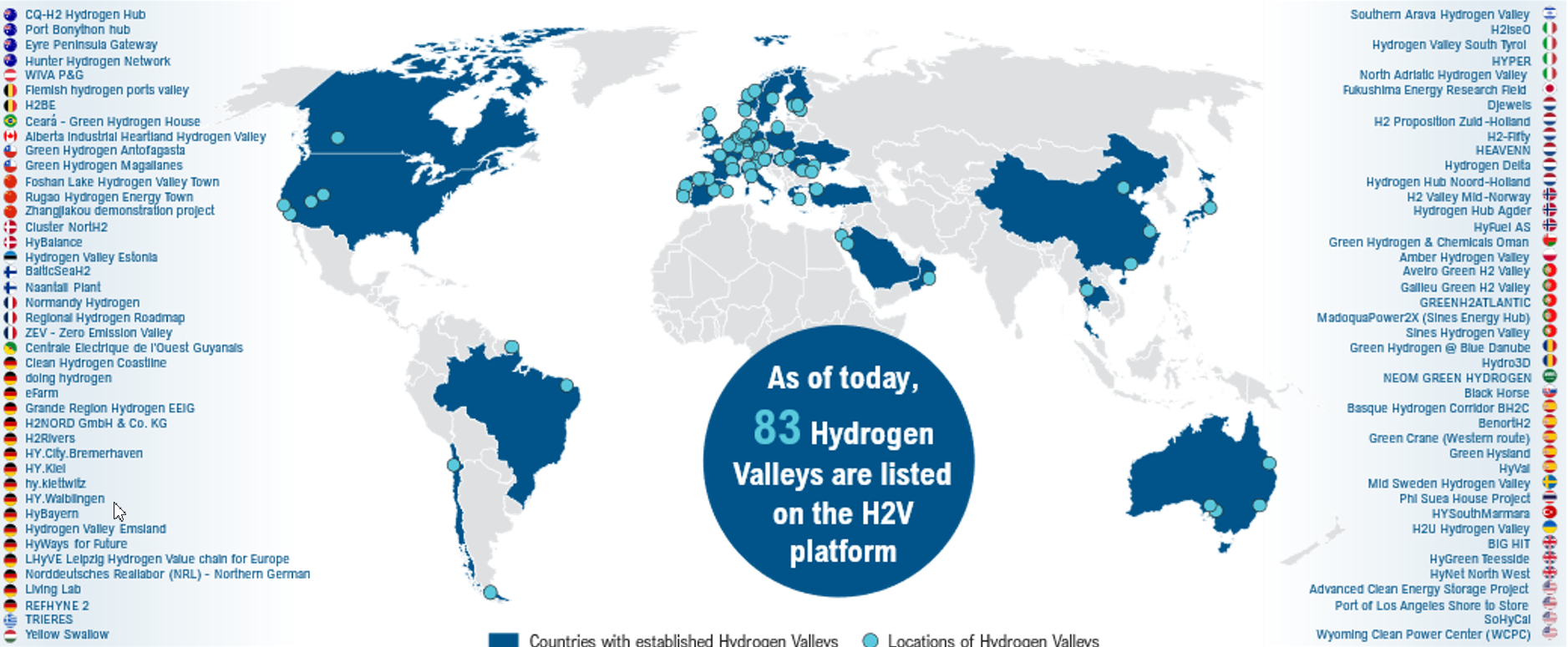 Actualmente hay 90 proyectos anunciados a nivel mundial, que están registrados en la base de datos H2V de la Clean Hydrogen Partnership y difieren en las tecnologías empleadas, las capacidades de producción de hidrógeno y las tecnologías involucradas. En el reporte del benchmarking internacional de Hubs de H2V se presenta información básica sobre la ubicación, inversiones involucradas, aplicaciones de los productos finales, principales desarrolladores y las tecnologías involucradas en los proyectos. La mayoría de los Hubs de H2V se localizan en Europa, mientras que el hidrógeno renovable por electrólisis es la principal ruta de producción aplicada. El almacenamiento de hidrógeno como gas comprimido es la opción de almacenamiento ampliamente preferida, mientras que el transporte por camiones y tuberías se implementa principalmente, lo que depende en gran medida de las características de la ubicación. Diferentes aplicaciones de uso final (industrial, transporte, energía) se combinan en un único Hub de hidrógeno, reubicando a una variedad de partes interesadas dentro de un área geográfica definida.