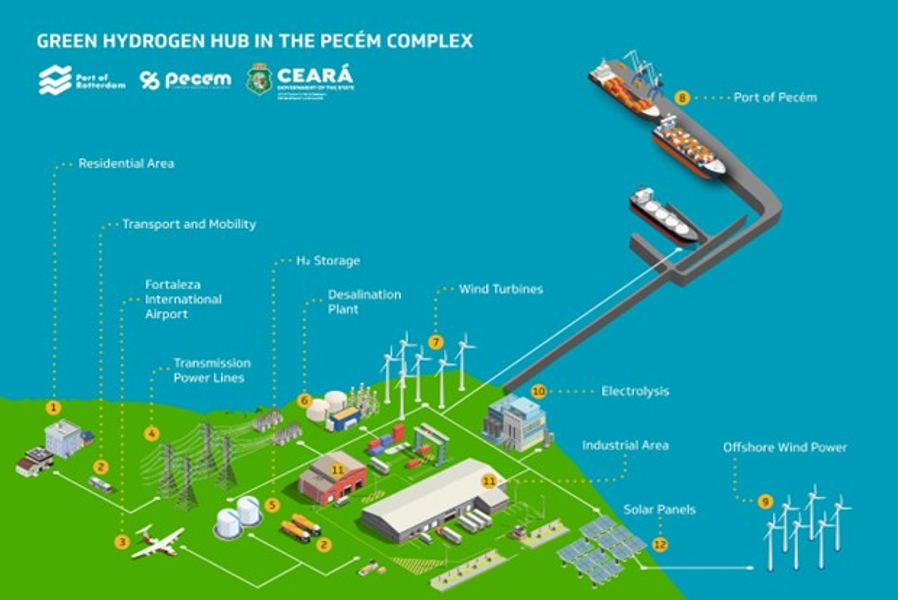 El Hub de Hidrógeno Verde de Ceará se ubica en el Complejo Industrial y Portuario de Pecém (CIPP), en Ceará, Brasil, y está dedicado a la producción de amoníaco verde destinado principalmente a la exportación hacia el mercado europeo. El CIPP es una empresa conjunta entre el gobierno del estado de Ceará y el puerto de Róterdam (Países Bajos), concebida como un Hub industrial y logístico de primer nivel.