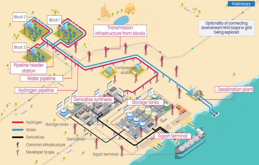 En la primera ronda, el año 2024 se celebró la primera ronda de adjudicación de terrenos. El plazo estándar de desarrollo de proyectos es de siete años, ya que Hydrom se esfuerza por alcanzar el objetivo de producción de 1 millón de toneladas métricas por año de hidrógeno verde para 2030. Los promotores ejecutarán proyectos integrados que incluyen la producción de energía renovable, la producción, conversión y consumo de hidrógeno. Los promotores que finalicen sus proyectos anticipadamente podrían obtener una exención de impuestos de hasta dos años. Hydrom coordinará la infraestructura común para todas las inversiones.