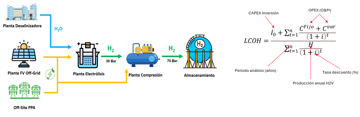 El costo nivelado del hidrógeno (LCOH, por sus siglas en inglés) es el coste de producción total (en dólares) de una planta de hidrógeno a lo largo de su vida útil, dividido por la cantidad de hidrógeno producido (kg de H2). Sirve como una métrica para comparar la rentabilidad de diferentes métodos de producción de hidrógeno y para evaluar la viabilidad financiera de un proyecto, teniendo en cuenta factores como el costo de capital, los gastos operativos y la eficiencia del proceso entre otros.